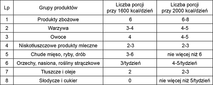Liczba porcji produktów ( dieta dla 1600 kcal/ dzień oraz 2000 kcal/dzień)