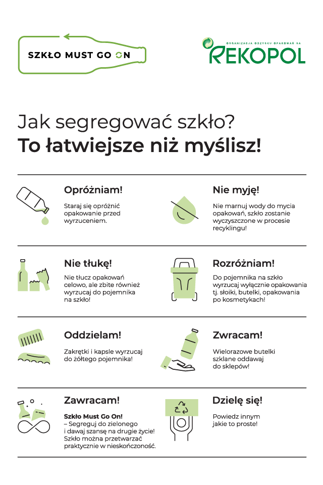 Kampania „Szkło Must Go On” jest częścią szerszej strategii Rekopolu, mającej na celu zwiększenie poziomu recyklingu nie tylko szkła w Polsce poprzez m.in. poprawę świadomości ekologicznej społeczeństwa. Od ponad dekady prowadzimy różne projekty mające na celu zwiększenie zbiórki szkła, tworzyw sztucznych, makulatury opakowaniowej czy stali i aluminium. Chcemy, aby Polska mogła bezpiecznie realizować swoje obowiązki w zakresie recyklingu, ale przyświeca nam również wymiar środowiskowy – chcemy, aby szkło (i inne surowce) wracało do obiegu, bo to się po prostu opłaca dla nas wszystkich – dodaje Tyczkowski.